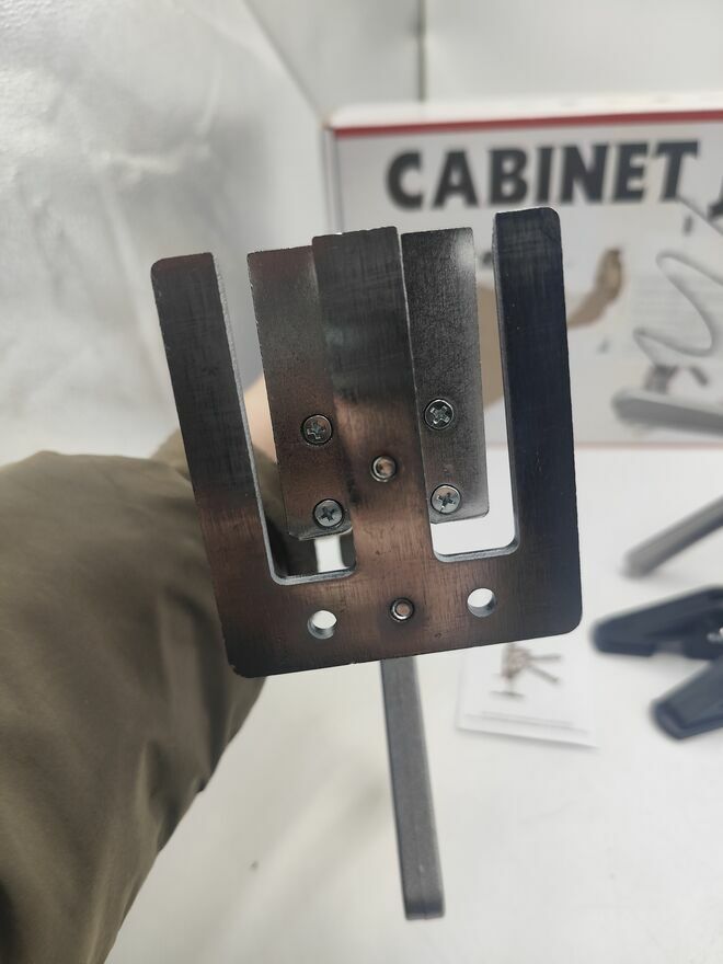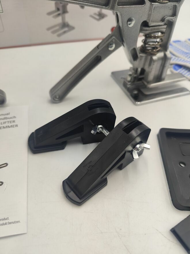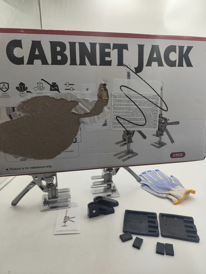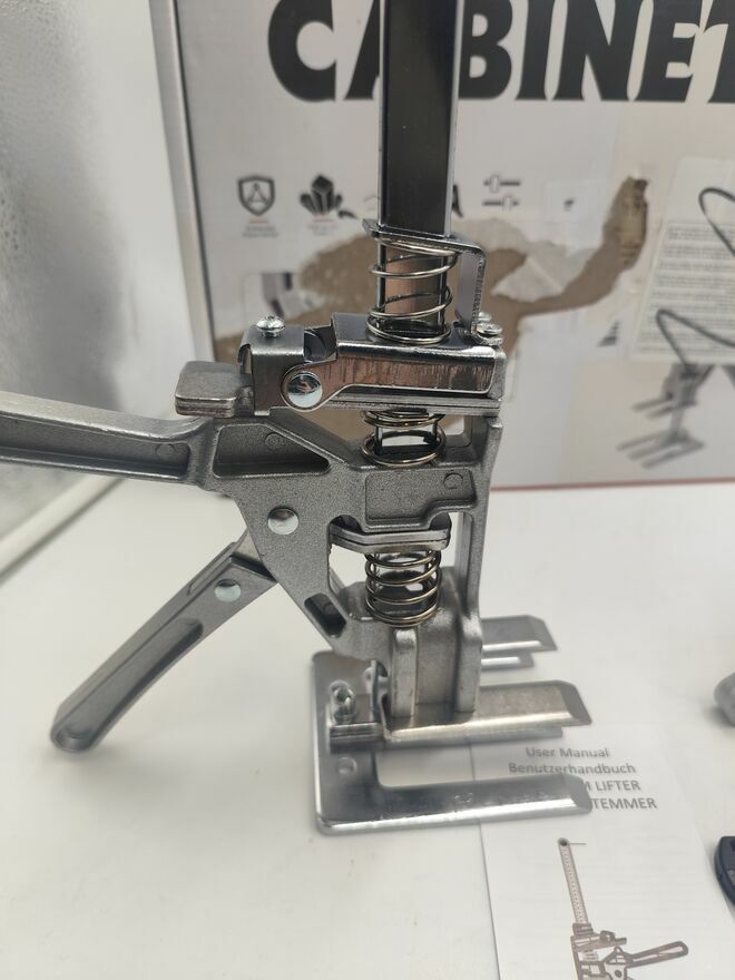 Stan bardzo dobry.Zestaw 2 sztuk podnośników montażowych (Cabinet Jack / Lever Arm Lifter) do precyzyjnego podnoszenia i poziomowania ciężkich elementów.